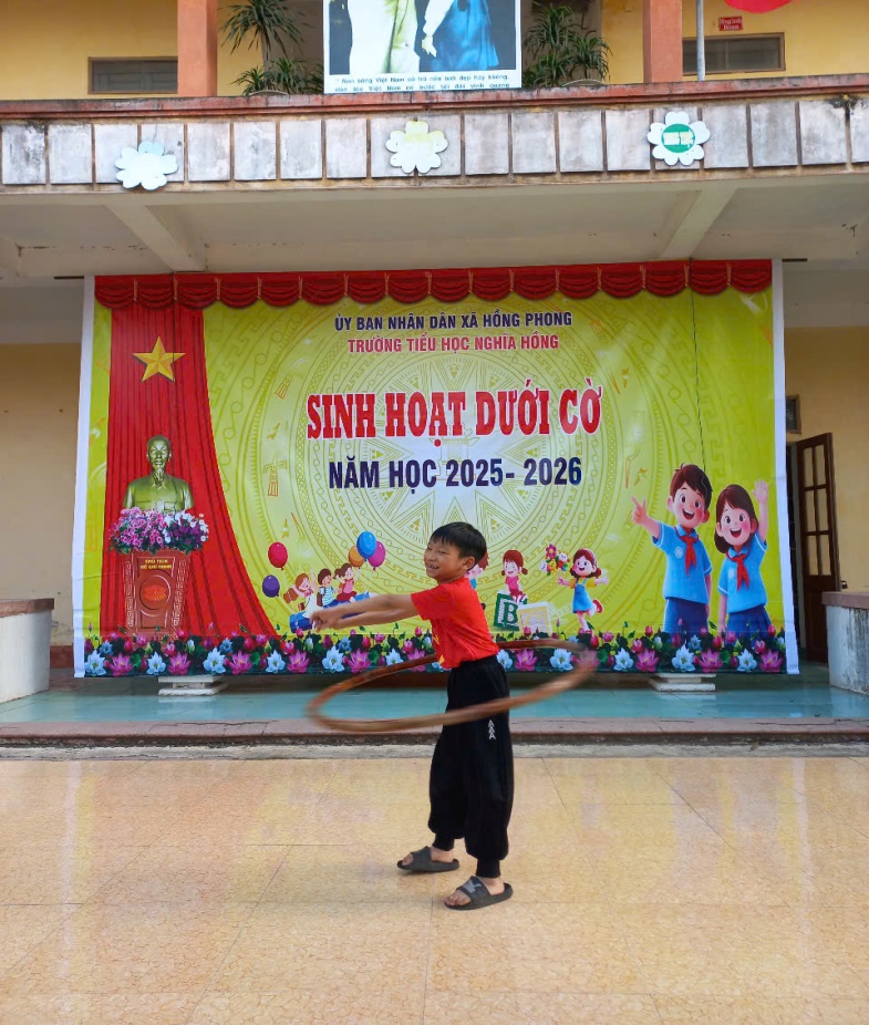 Kết thúc buổi trải nghiệm là Tiết mục lắc vòng của 2 em học sinh lớp 3A3 đã mang đến không khí tươi vui và năng động cho buổi chào cờ. Những vòng lắc uyển chuyển cùng nụ cười rạng rỡ thể hiện nét đẹp hồn nhiên, tự tin và trong sáng của tuổi học trò. Không chỉ là một màn biểu diễn khéo léo, tiết mục còn gửi gắm thông điệp về tinh thần đoàn kết, sự chăm chỉ luyện tập và tình yêu trường lớp. Đây thực sự là nét đẹp học trò giản dị mà đáng quý.